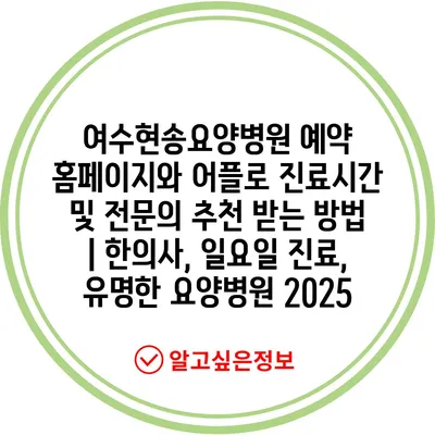 여수현송요양병원 예약 홈페이지와 어플로 진료시간 및 전연락 추천 받는 방법 | 한의사, 일요일 진료, 유명한 요양병원 2025 에 대해 자주 묻는 질문 TOP 5